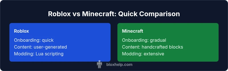 Roblox versus Minecraft presents two distinct sandbox visions. Roblox prioritizes social play and user-generated experiences, while Minecraft emphasizes building, exploration, and mod-friendly depth. For quick guidance, Roblox is typically easier to start with and offers a broad social catalog; Minecraft suits players who want deep crafting, modding, and long-term world-building. Your choice hinges on goals and play style.