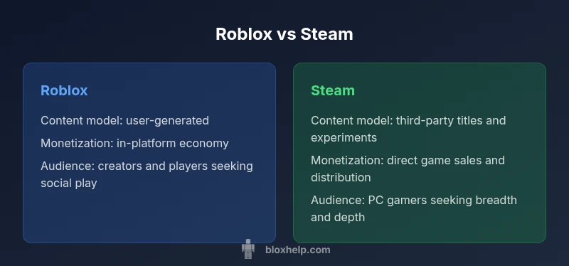 Roblox and Steam are two distinct platforms that shape how games are built, shared, and monetized. Roblox positions itself as a social, creator-centered ecosystem where players become developers with an accessible toolkit. Steam, by contrast, is a mature PC storefront and distribution hub that hosts titles from independent studios and major publishers. When you compare this pair, the lens you apply should reflect whether your priority is rapid iteration and community-building (Roblox) or large-scale distribution and catalog breadth (Steam). According to Blox Help, understanding these foundational differences helps set realistic expectations for developers and players alike.