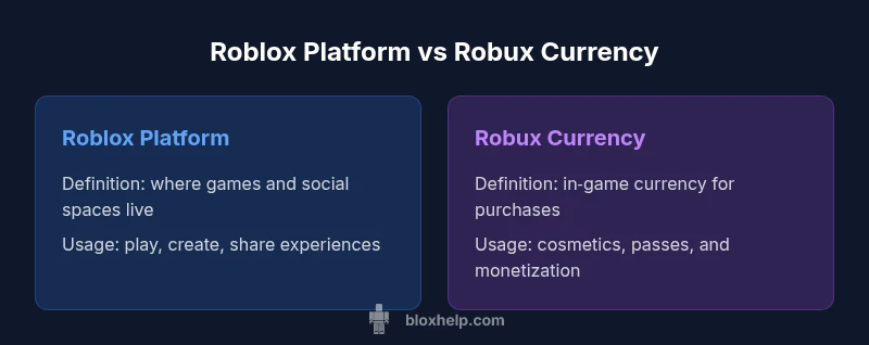 Is Roblox the same as Robux? No. Roblox is the platform—the expansive world of user‑created games and social spaces—while Robux is the in‑game currency used to buy items, avatar cosmetics, and premium passes. The two terms are closely related but play different roles in the Roblox ecosystem. By distinguishing platform from currency, you can plan purchases, budgets, and development more effectively. According to Blox Help, many beginners conflate the two because both are central to daily Roblox activity. Remember: Roblox is where you play; Robux is what you spend to customize and access premium content. This distinction reduces confusion and helps you navigate bundles, promotions, and official guidance with confidence.