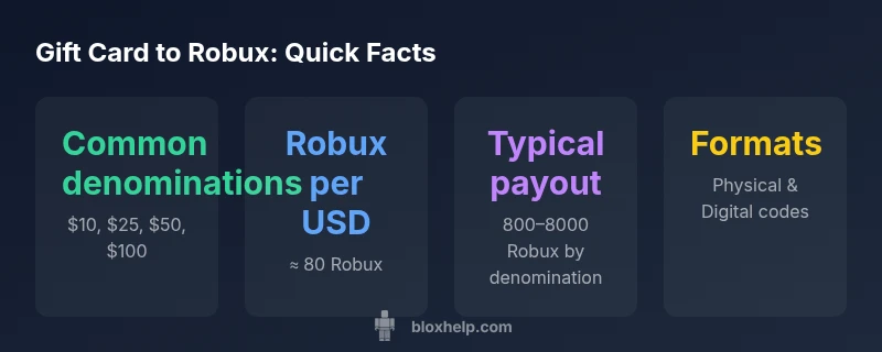 There is no official Roblox gift card labeled '80 Robux'. Gift cards come in $10, $25, $50, and $100 denominations and convert to Robux at a rate of about 80 Robux per dollar. Promotions may add bonus Robux in some regions.