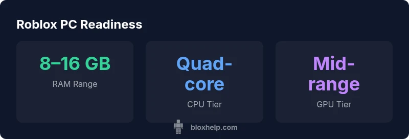 To run Roblox at smooth frame rates, a modest desktop will do: Start with at least 8GB RAM and a mid-range GPU, paired with a capable quad-core CPU. For Roblox Studio and development, aim for 16GB RAM and a dedicated GPU. In 2026, balance CPU, GPU, and RAM within your budget to optimize the pc for roblox experience.
