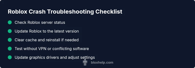 According to Blox Help, most roblox crash issues stem from connectivity problems, an outdated client, or corrupted cache. Quick fixes: 1) restart your device and router, 2) update Roblox to the latest version, 3) clear the Roblox cache and reinstall if needed, 4) disable VPN or overly aggressive antivirus, 5) check Roblox server status. If the problem persists, follow the diagnostic flow below.