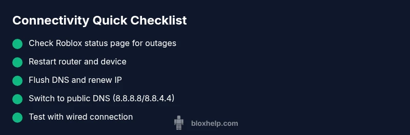 Commonly, Roblox problem reaching servers is caused by a local network issue, a Roblox outage, or DNS problems. Start with quick checks: view Roblox Status, reboot router and device, and flush DNS. If the issue persists, follow a diagnostic flow to isolate whether the problem is on your side, your ISP, or Roblox itself. Proceed through guided steps for faster recovery.