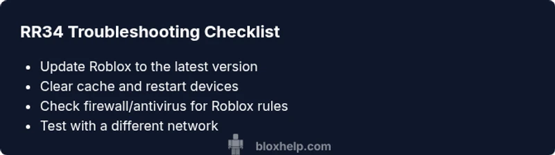 Roblox RR34 signals a startup or connection failure that blocks you from loading Roblox or joining games. The quickest fixes are to restart your router and device, update the Roblox client, and temporarily adjust firewall or antivirus rules. If the issue persists, reinstall Roblox or perform a network reset. The Blox Help team notes these quick fixes solve the majority of RR34 cases.