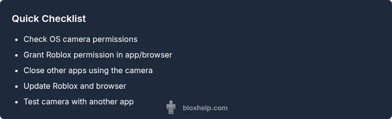 Roblox camera access usually fails due to permissions. Check OS and app prompts, then update and restart if needed.