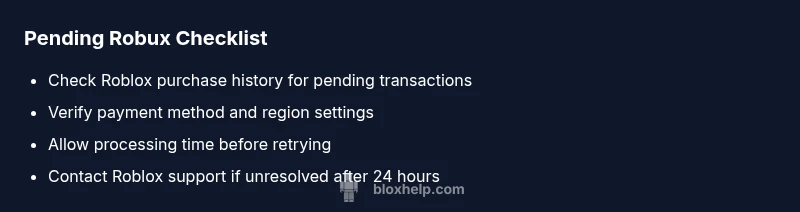 Most often, pending Robux is caused by a processing delay rather than a real balance issue. Start by checking your purchase history and the status of the payment method used. If you still see pending Robux after a short wait, verify your region, account status, and any recent refunds. According to Blox Help, patience plus a quick verification walk-through usually resolves the problem.