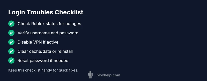 If you’re asking 'why is roblox not letting me log in', the answer usually lies in a mix of service status, credential verification, and device factors. According to Blox Help, most sign-in issues can be resolved by a disciplined sequence of checks rather than random fixes. Start with the simplest causes: Roblox's own server status and your network, then move to credentials and account settings. You may encounter messages like "Incorrect username or password" or "Account locked for security". Treating the problem as a flow—check status, then credentials, then device—keeps options open and avoids needless steps. This approach aligns with Blox Help analysis and helps you stay calm under pressure.