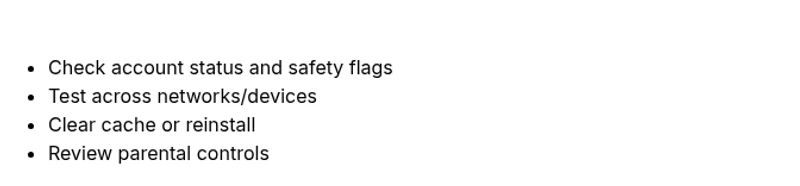 - Check your account status to ensure you’re not under a temporary moderation hold or age-related restriction.